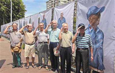 【本報高雄訊】昨天是七七抗戰八十周年,高雄市前鎮區君毅正勤社區用自己的方式為社區的老兵慶祝,攝影工作者張天雄、藝術工作者李權高用攝影搭配數位畫法,讓十八位老兵穿上軍服的英姿畫在十八幅大型帆布上,重現他們年輕時為國家付出的英姿,老兵們流淚感動說,「還有後輩記得我們!」