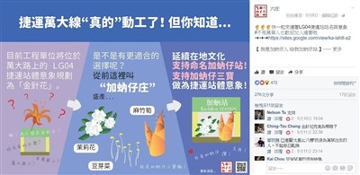 南萬華青年組成社團「六庄」,月前透過臉書粉絲頁發起「我是加蚋仔人,給我加蚋仔站」連署,如今LG04站確定命名為加蚋站。 圖/取自「六庄」粉絲頁