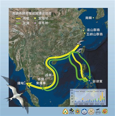 【本報台北訊】農委會林務局昨天公布,失蹤八十年的「神話之鳥」黑嘴端鳳頭燕鷗兩大遷徙路徑,研究團隊利用衛星發報器追蹤發現,燕鷗夏季在台灣繁殖結束後會兵分兩路,一路橫越海峽駐足菲律賓,一路循大陸東南沿海飛往中南半島的越南、泰國、柬埔寨,最遠甚至抵達緬甸。由於黑嘴端鳳頭燕鷗不到百隻,林務局將於八月底召開國際會議,即刻護育。
