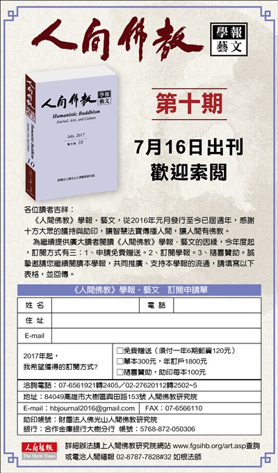 索取《人間佛教學報‧藝文》 |2017.07.13 語音朗讀 556觀看次 字級 大 中 小 索取《人間佛教學報‧藝文》第十期7/16出刊,歡迎索閱。 詳細辦法請上人間佛教研究院網站www.fgsihb.org/art.asp查詢 前一篇文章 故鄉的雲獻禮音樂會 周末高雄演出 下一篇文章 台南西港 國產胡麻最大產區 熱門新聞 01南投太極美地空中纜車 下半年動工2026.03.2202珍寶入地宮 法華經奉納佛光大佛2026.03.2103非洲人象共享生存空間 蜜蜂化解衝突2026.03.2104中南部大旱 高雄3月已73件山林火警 2026.03.2105星雲大師全集㉑【佛教管理學③】弘法系列人事篇—人事管理法⑬2026.03.2106鑲嵌藝術2026.03.2307星雲大師靈骨分燈北美 法脈永傳2026.03.2408【轉角風景】幽靜觀賞 三色寒櫻2026.03.2209人間佛教聯合總會訪越南 弘法新契機2026.03.2310蔣萬安感謝台北道場 共創城市亮點2026.03.23 訂閱電子報 台北市 天氣預報 台灣一週天氣預報 相關報導 以文字護持人間福報運動睡眠新科技 養生保健新利器房仲第一品牌 永慶加薪3% 體驗美好手作 製皂幸福時光 博愛社大春季班招生中 薩克斯風吹奏春季班 人間大學台中分校招生中 跨越十年縱橫南半球到北半球 《行者》新書上市