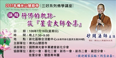 慧慈寺7/16佛學講座 |2017.07.14 語音朗讀 553觀看次 字級 大 中 小 慧慈寺7/16佛學講座 時間:晚上7時30分~9時 地點:新化區聯合活動中心 前一篇文章 潮州講堂8/5傳授三皈五戒 下一篇文章 極樂寺7/14佛學講座暨佛化婚禮 熱門新聞 01南投太極美地空中纜車 下半年動工2026.03.2202鑲嵌藝術2026.03.2303【詩】白花鬼2026.03.2504【轉角風景】幽靜觀賞 三色寒櫻2026.03.2205故宮特展神獸再現 麒麟、鳳凰登場 2026.03.2406星雲大師靈骨分燈北美 法脈永傳2026.03.2407中南部水庫水位告急 各地農損頻傳2026.03.2408人間佛教聯合總會訪越南 弘法新契機2026.03.2309沉浸式共織宇宙 在新北美術館2026.03.2310蔣萬安感謝台北道場 共創城市亮點2026.03.23 訂閱電子報 台北市 天氣預報 台灣一週天氣預報 相關報導 以文字護持人間福報運動睡眠新科技 養生保健新利器房仲第一品牌 永慶加薪3% 體驗美好手作 製皂幸福時光 博愛社大春季班招生中 薩克斯風吹奏春季班 人間大學台中分校招生中 跨越十年縱橫南半球到北半球 《行者》新書上市