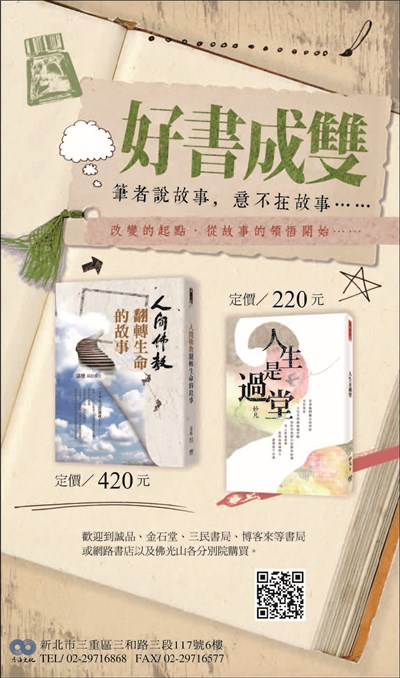 好書成雙 筆者說故事 |2017.07.15 語音朗讀 671觀看次 字級 大 中 小 好書成雙筆者說故事,香海文化出版《人生是過堂》、《人間佛教翻轉生命的故事》歡迎至誠品、金石堂、三民書局、博客來或網路書局及佛光山分別院購買。 歡迎至誠品、金石堂、三民書局、博客來或網路書局及佛光山分別院購買。 前一篇文章 故鄉的雲獻禮音樂會7/15高雄獻唱 下一篇文章 佛光山叢林學院9/3開學 熱門新聞 01【詩】白花鬼2026.03.2502鑲嵌藝術2026.03.2303故宮特展神獸再現 麒麟、鳳凰登場 2026.03.2404南華大學茶禪雅集 靜坐書寫時光膠囊2026.03.2605楊筑云、林芷均 奧爾良羽賽獲亞軍2026.03.2306星雲大師靈骨分燈北美 法脈永傳2026.03.2407星雲大師靈骨分燈歐洲 傳燈萬方2026.03.2608中南部水庫水位告急 各地農損頻傳2026.03.2409人間佛教聯合總會訪越南 弘法新契機2026.03.2310沉浸式共織宇宙 在新北美術館2026.03.23 訂閱電子報 台北市 天氣預報 台灣一週天氣預報 相關報導 以文字護持人間福報運動睡眠新科技 養生保健新利器房仲第一品牌 永慶加薪3% 體驗美好手作 製皂幸福時光 博愛社大春季班招生中 薩克斯風吹奏春季班 人間大學台中分校招生中 跨越十年縱橫南半球到北半球 《行者》新書上市