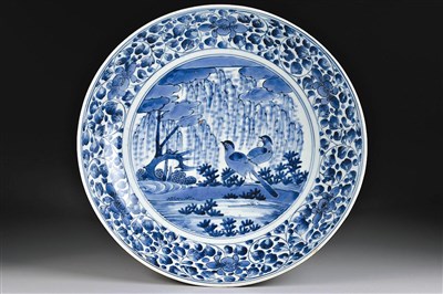 國立故宮博物院南部院區目前正在展出「揚帆萬里─日本伊萬里瓷器特展」,昨展場人員在開館前檢測發現其中一件文物「青花柳葉鳥紋盤」(圖/故宮提供)從展架上掉落,大阪市立東洋陶瓷美術館研究部主任暨策展人小林仁昨日中午抵台,隨即前往嘉義故宮南院檢測。