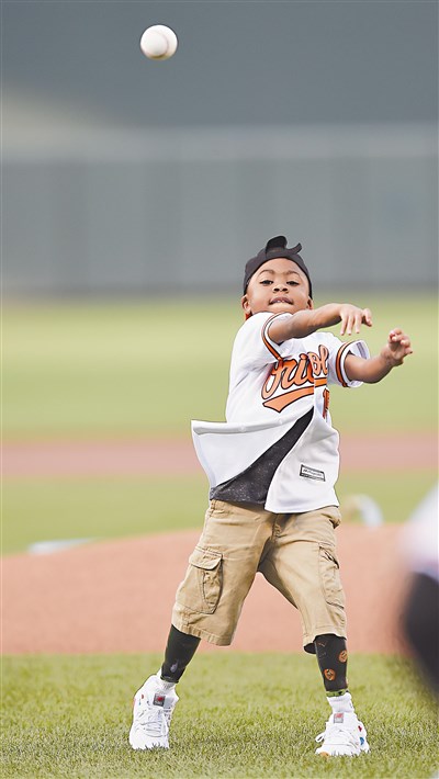 錫安,哈維是世界上第一個雙手移植的孩子,圖為他為美國職棒巴爾的摩金鶯隊與德州遊騎兵隊的比賽開球。圖/美聯社