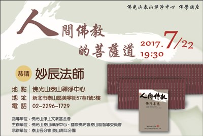 7/22泰山禪淨中心佛學講座 |2017.07.20 語音朗讀 938觀看次 字級 大 中 小 7/22泰山禪淨中心佛學講座 地點:佛光山泰山禪淨中心 地址:新北市泰山區美寧街57巷1號5樓 電話:02-22961729 前一篇文章 潮州講堂8/5傳授三皈五戒 下一篇文章 人間佛學網路影音平台 24小時觀看 熱門新聞 01故宮特展神獸再現 麒麟、鳳凰登場 2026.03.2402【詩】白花鬼2026.03.2503南華大學茶禪雅集 靜坐書寫時光膠囊2026.03.2604星雲大師靈骨分燈歐洲 傳燈萬方2026.03.2605佛光山365日越文版 贈西貢日航大酒店2026.03.2706星雲大師靈骨分燈北美 法脈永傳2026.03.2407中南部水庫水位告急 各地農損頻傳2026.03.2408台灣工藝3專書 呈現文化獨特樣貌2026.03.2709紅綠葡萄抗氧化抗發炎 連皮吃獲取健康全效益2026.03.2710兒童節禮物 新北學生自己票選2026.03.26 訂閱電子報 台北市 天氣預報 台灣一週天氣預報 相關報導 以文字護持人間福報運動睡眠新科技 養生保健新利器房仲第一品牌 永慶加薪3% 體驗美好手作 製皂幸福時光 博愛社大春季班招生中 薩克斯風吹奏春季班 人間大學台中分校招生中 跨越十年縱橫南半球到北半球 《行者》新書上市