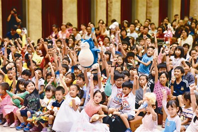 【人間社記者宋滌姬高雄報導】布滿小星星的夜晚,蝴蝶、小毛驢、兩隻老虎、白鷺鸞、虎姑婆、龍貓……從樂器中化為童謠出現,會是多麼熱鬧有趣的情景呢?為寓教於樂、推廣三好精神,佛光山南屏別院「二○一七三好放光兒童藝術教育系列」將溫馨的故事與好聽的童謠相結合,於二十一日邀請「六藝樂團」演出《動畫童謠親子音樂會》,高雄市教育局長范巽綠也帶著衛武營的吉祥物「花露露」前來,與千餘位大朋友、小朋友共享歡樂的音樂盛宴。