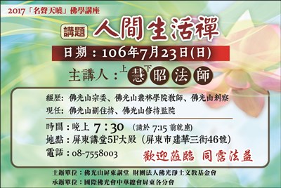 屏東講堂2017年「名聲天曉」佛學講座 |2017.07.21 語音朗讀 341觀看次 字級 大 中 小 屏東講堂2017年「名聲天曉」佛學講座。 講題:人間生活禪 時間:晚上7:30 地點:屏東講堂5F大殿(屏東市建華三街46號) 歡迎蒞臨 同霑法益 前一篇文章 心的旅程 生活美學‧身心假期 下一篇文章 訂閱福報送母校 熱門新聞 01故宮特展神獸再現 麒麟、鳳凰登場 2026.03.2402南華大學茶禪雅集 靜坐書寫時光膠囊2026.03.2603【詩】白花鬼2026.03.2504星雲大師靈骨分燈歐洲 傳燈萬方2026.03.2605佛光山365日越文版 贈西貢日航大酒店2026.03.2706紅綠葡萄抗氧化抗發炎 連皮吃獲取健康全效益2026.03.2707台灣工藝3專書 呈現文化獨特樣貌2026.03.2708星雲大師靈骨分燈北美 法脈永傳2026.03.2409中南部水庫水位告急 各地農損頻傳2026.03.2410兒童節禮物 新北學生自己票選2026.03.26 訂閱電子報 台北市 天氣預報 台灣一週天氣預報 相關報導 以文字護持人間福報運動睡眠新科技 養生保健新利器房仲第一品牌 永慶加薪3% 體驗美好手作 製皂幸福時光 博愛社大春季班招生中 薩克斯風吹奏春季班 人間大學台中分校招生中 跨越十年縱橫南半球到北半球 《行者》新書上市