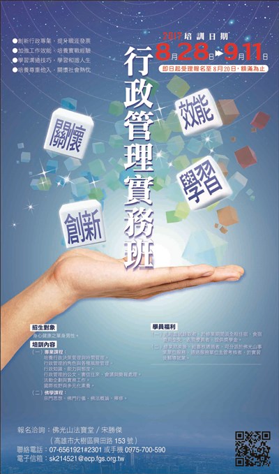 行政管理實務班 |2017.07.30 語音朗讀 516觀看次 字級 大 中 小 行政管理實務班 招生對象:身心健康之單身男性 專業課程及佛學課程培訓,凡經面試錄取者,於修業期間須全程住宿,食宿費用全免,表現優異者提供獎學金,修業結束後經審核通過者,可分派於佛光山事業單位服務,於實習後輔導就業。 報名洽詢:佛光山法寶堂/宋勝傑 聯絡電話:07-6561921#2301或手機0975-700-590 信箱:sk214521@ecp.fgs.org.tw 前一篇文章 佛光豆漿麵 香濃好滋味 下一篇文章 2017佛光盃籃球賽7/30賽程表 熱門新聞 01長照3.0增「互助喘息」 用服務換照顧2026.03.2802華府櫻花綻放 吸引遊客2026.03.2803穩定物價 4月起電價凍漲 2026.03.2804雲林最炫兒童節 孩童搭乘熱氣球2026.03.2805宜蘭至羅東鐵路高架化 消除9平交道4陸橋2026.03.2806能源漲價 央行逐季檢視通膨2026.03.2807佛光山月光寺啟用 花蓮心靈新地標2026.03.2908推動科學辦案 鑑識權威李昌鈺87歲辭世2026.03.2909俄烏戰燒錢 普亭向俄富豪募款 2026.03.2810塞內加爾紀念碑 闡述販奴黑歷史2026.03.28 訂閱電子報 台北市 天氣預報 台灣一週天氣預報 相關報導 以文字護持人間福報運動睡眠新科技 養生保健新利器房仲第一品牌 永慶加薪3% 體驗美好手作 製皂幸福時光 博愛社大春季班招生中 薩克斯風吹奏春季班 人間大學台中分校招生中 跨越十年縱橫南半球到北半球 《行者》新書上市