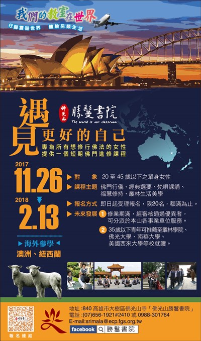 勝鬘書院 行腳雲遊世界 |2017.07.31 語音朗讀 536觀看次 字級 大 中 小 勝鬘書院 行腳雲遊世界 對象:20至45歲以下之單身女性,即日起受理報名。 前一篇文章 2017年佛光山在家五戒菩薩戒會通啟 下一篇文章 尋找內新的名牌-莊志輝世界巡迴創作個展 熱門新聞 01華府櫻花綻放 吸引遊客2026.03.2802長照3.0增「互助喘息」 用服務換照顧2026.03.2803穩定物價 4月起電價凍漲 2026.03.2804雲林最炫兒童節 孩童搭乘熱氣球2026.03.2805宜蘭至羅東鐵路高架化 消除9平交道4陸橋2026.03.2806能源漲價 央行逐季檢視通膨2026.03.2807佛光山月光寺啟用 花蓮心靈新地標2026.03.2908推動科學辦案 鑑識權威李昌鈺87歲辭世2026.03.2909俄烏戰燒錢 普亭向俄富豪募款 2026.03.2810塞內加爾紀念碑 闡述販奴黑歷史2026.03.28 訂閱電子報 台北市 天氣預報 台灣一週天氣預報 相關報導 以文字護持人間福報運動睡眠新科技 養生保健新利器房仲第一品牌 永慶加薪3% 體驗美好手作 製皂幸福時光 博愛社大春季班招生中 薩克斯風吹奏春季班 人間大學台中分校招生中 跨越十年縱橫南半球到北半球 《行者》新書上市