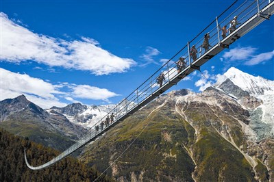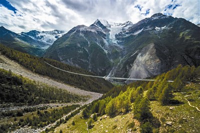 【本報綜合外電報導】全球最長行人吊橋「歐洲大橋」(Europe Bridge)七月二十九日在瑞士啟用,成為徒步旅行者欣賞馬特洪峰(Matterhorn)景色的絕佳地點,更令來往山谷的路程大大縮減。