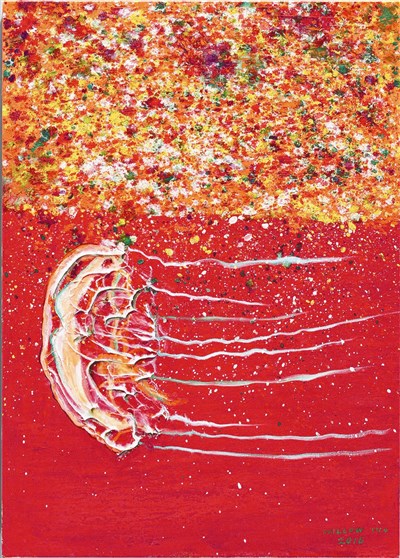 吳柳的創作靈感來自水母,為了掌握水母的特性,曾親赴帛琉水母湖,與水母共游,用最直接的接觸與體驗感受水母的生命力,把存在地球已超過六點五億年歲月的水母,以各種面貌呈現於畫作。