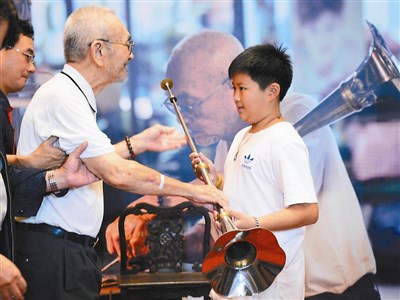 魏幼謙(左)把親手製作的國寶級哨角贈送給建國國中的學生。