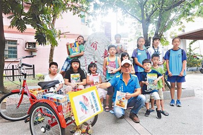 他還打造「三輪漂書車」,有趣的是,漂書車捨棄擾人清夢的大聲公及喇叭,而是在車體後方以細繩拖曳數個舊鋁罐,行進間鋁罐發出「哐噹哐噹」聲響,彷彿替「漂書」奏響行進樂,清脆聲響吸引用路人目光,也吸引愛書人聞聲而至;而路上小朋友看到漂書車內顏色繽紛的各類書籍,總是揮手要里長伯停車,挑到喜歡的就免費帶回家。