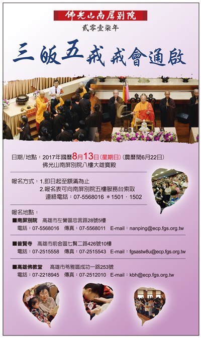 佛光山南屏別院8/13三皈五戒戒會通啟 |2017.08.03 語音朗讀 1433觀看次 字級 大 中 小 佛光山南屏別院8/13三皈五戒戒會通啟 報名方式:1.即日起至額滿為止 2.報名表可至南屏別院五樓服務台索取 聯絡電話:07-5568016*1501、1502 報名地點:南屏別院 07-5568016 高雄市左營區忠言路28號5樓 普賢寺 07-2515558 高雄市前鎮區七賢二路426號10樓 高雄佛教堂 07-2218945 高雄市苓雅區成功一路253號 前一篇文章 2017全民閱讀博覽會 下一篇文章 輕井澤・日本佛光山法水寺深度旅遊 熱門新聞 01佛光山月光寺啟用 花蓮心靈新地標2026.03.2902推動科學辦案 鑑識權威李昌鈺87歲辭世2026.03.2903道奇頒冠軍戒 大谷喊要更多枚2026.03.2904中職開幕戰 猿隊險勝兄弟2026.03.2905川普誇耀政績 陸採購大豆倍增2026.03.2906最大規模無王日 逾3200場反川示威2026.03.3007汽油飆漲 1.7 元 創 11 年半新高2026.03.2908宜蘭綠博會 探索真理2026.03.3009陸首都維安 北京全面管制無人機2026.03.3010MLB 鄧愷威轉隊太空人 初登板奪首勝2026.03.30 訂閱電子報 台北市 天氣預報 台灣一週天氣預報 相關報導 以文字護持人間福報運動睡眠新科技 養生保健新利器房仲第一品牌 永慶加薪3% 體驗美好手作 製皂幸福時光 博愛社大春季班招生中 薩克斯風吹奏春季班 人間大學台中分校招生中 跨越十年縱橫南半球到北半球 《行者》新書上市
