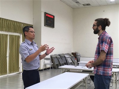外事科巡佐江明倫是中華大學應用外文系畢業。他說,口試測驗則有指引方向、受理報案、隨車人員自我介紹及事故處置等不同主題,由勤務人員隨機抽選現場測驗;還請外籍人士扮演報案民眾以英語對話,實境練習。
