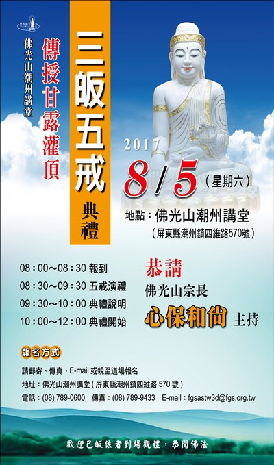 潮州講堂8/5傳授三皈五戒 |2017.08.04 語音朗讀 679觀看次 字級 大 中 小 潮州講堂8/5傳授三皈五戒 報名方式:請郵寄、傳真、E-mail或親至道場報名 前一篇文章 金蘭甘露醬油180天恆溫釀造 下一篇文章 輕井澤・日本佛光山法水寺深度旅遊 熱門新聞 01最大規模無王日 逾3200場反川示威2026.03.3002宜蘭綠博會 探索真理2026.03.3003陸首都維安 北京全面管制無人機2026.03.3004MLB 鄧愷威轉隊太空人 初登板奪首勝2026.03.3005美首批陸戰隊抵中東 地面戰在即2026.03.3006乾旱嚴峻 雲林古坑春茶產量腰斬2026.03.3007北韓強化戰略武器2026.03.3008拉斐爾壁畫2026.03.3009昆士蘭協會 榮獲洛根市文化影響力獎2026.03.3010剛果文化壁畫2026.03.30 訂閱電子報 台北市 天氣預報 台灣一週天氣預報 相關報導 以文字護持人間福報運動睡眠新科技 養生保健新利器房仲第一品牌 永慶加薪3% 體驗美好手作 製皂幸福時光 博愛社大春季班招生中 薩克斯風吹奏春季班 人間大學台中分校招生中 跨越十年縱橫南半球到北半球 《行者》新書上市