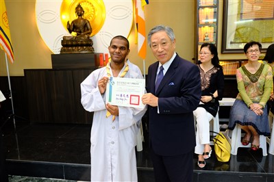 田中光為通過測驗的小沙彌頒授證書,勉勵小沙彌更加努力,把華語文學得更好,向更高階的華語文能力測驗挑戰。
