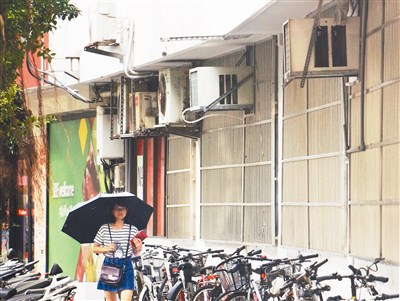 昨天北部高溫飆到攝氏三十八度五,刷新今年全台最高溫紀錄,用電量也隨之上升。圖為北市街頭外牆冷氣一景。