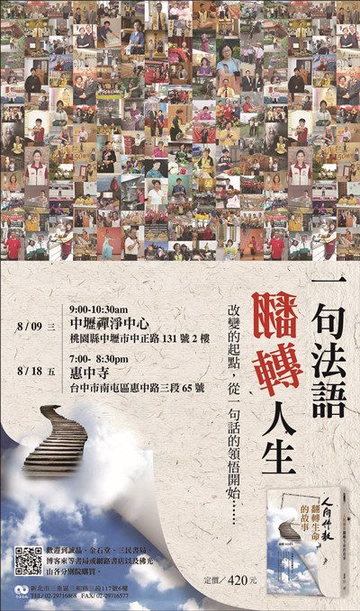 香海文化「人間佛教 翻轉生命的故事」新書發表會 |2017.08.08 語音朗讀 974觀看次 字級 大 中 小 香海文化「人間佛教 翻轉生命的故事」新書發表會 請一起來體驗「一句話翻轉生命」的感動 8/9(三)早上9:00-10:30於中壢禪淨中心舉辦新書發表會 地址:桃園縣中壢市中正路131號2樓 8/18(五)晚上7:00-8:00於惠中寺舉辦新書發表會 地址:台中市南屯區惠中路三段65號 前一篇文章 永和學舍秋季社教課程 下一篇文章 索取《人間佛教學報‧藝文》 熱門新聞 01祖厝大變身 王榮文打造農夫美術館2026.03.3102苗栗漁港冒藍眼淚 縣府將檢測水質2026.03.3103明德水庫蓄水量僅27% 今起供4停42026.04.0104【讓愛自由】纏繞與獨立之間2026.04.0205新生首次到校2026.04.0206星雲大師靈骨分燈日本 法燈長明2026.04.0107佛光會理監事會議 佛光精神深耕全球2026.03.31089公尺高恐龍 現身澄清湖2026.04.0109東京櫻花滿開2026.04.0110星雲大師靈骨分燈泰國 化益世人2026.04.02 訂閱電子報 台北市 天氣預報 台灣一週天氣預報 相關報導 以文字護持人間福報運動睡眠新科技 養生保健新利器房仲第一品牌 永慶加薪3% 體驗美好手作 製皂幸福時光 博愛社大春季班招生中 薩克斯風吹奏春季班 人間大學台中分校招生中 跨越十年縱橫南半球到北半球 《行者》新書上市