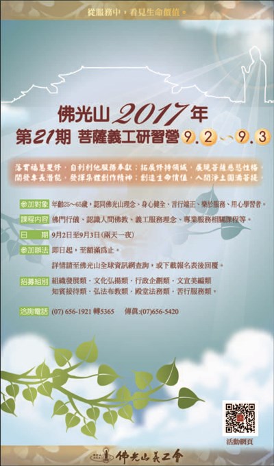 2017年佛光山菩薩義工研習營 |2017.08.09 語音朗讀 683觀看次 字級 大 中 小 2017年佛光山菩薩義工研習營 落實福慧雙修,自利利他服務奉獻精神。 洽詢電話:07-656-1921轉5365 傳真:07-656-5420 前一篇文章 金蘭醬油慶中元 下一篇文章 香海文化新書推薦《人生是過堂》 熱門新聞 01【讓愛自由】纏繞與獨立之間2026.04.0202明德水庫蓄水量僅27% 今起供4停42026.04.0103新生首次到校2026.04.0204星雲大師靈骨分燈日本 法燈長明2026.04.0105星雲大師靈骨分燈泰國 化益世人2026.04.02069公尺高恐龍 現身澄清湖2026.04.0107東京櫻花滿開2026.04.0108打字機重返課堂 對抗AI代寫2026.04.0209中美並重 鄭麗文傳6月訪美2026.04.0110睽違53年 NASA載人繞月1日升空2026.04.01 訂閱電子報 台北市 天氣預報 台灣一週天氣預報 相關報導 以文字護持人間福報運動睡眠新科技 養生保健新利器房仲第一品牌 永慶加薪3% 體驗美好手作 製皂幸福時光 博愛社大春季班招生中 薩克斯風吹奏春季班 人間大學台中分校招生中 跨越十年縱橫南半球到北半球 《行者》新書上市