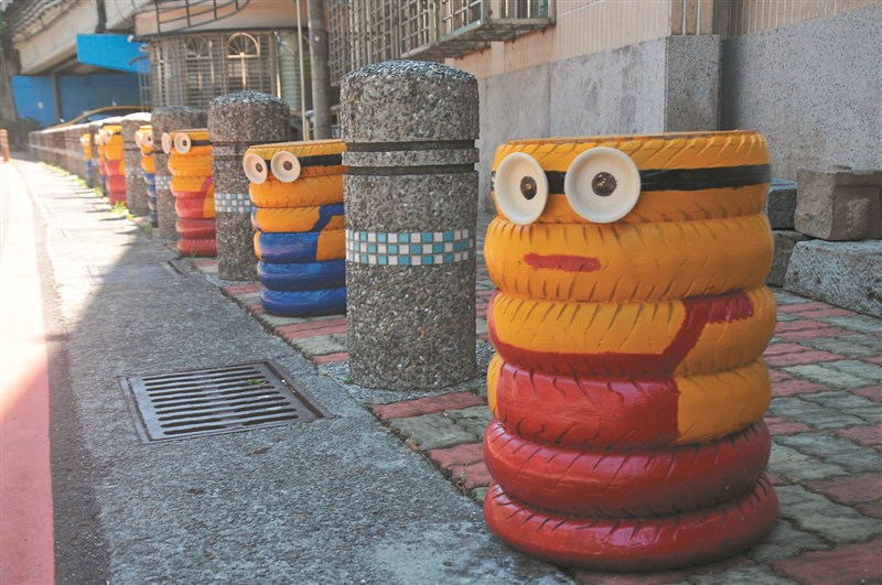葉步有把六個輪胎串在一起,再找花盆來當眼睛,接著上油漆,畫成一個個色彩不同的「小小兵」, 但必須用木板釘好頭和底部,不能積水。黑呼呼又髒兮兮沒人要的廢輪胎,經他巧手變成美美的裝飾品。