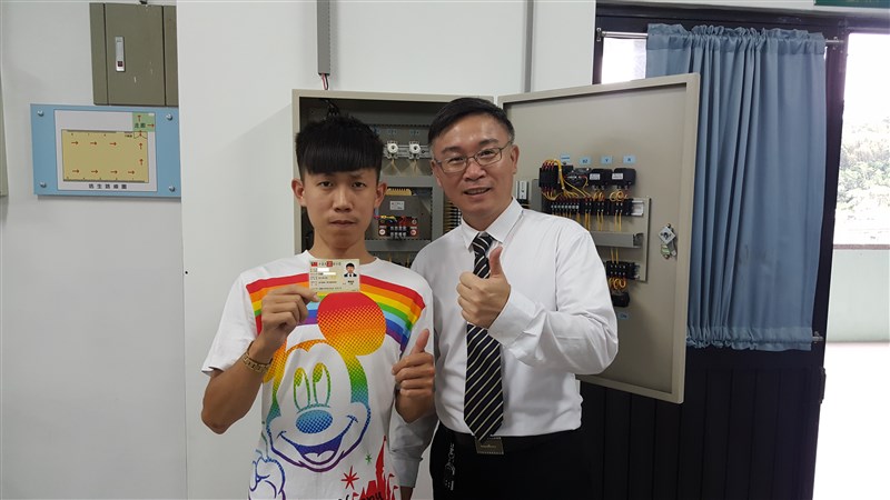 陳孟庭同學與數位科技設計系系主任葉律佐,在本校的國家級室內配線證照考場合影。