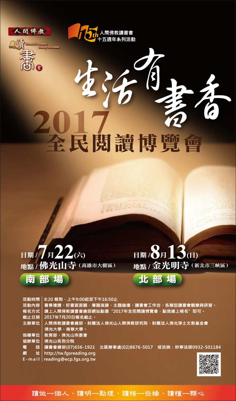 2017全民閱讀博覽會 |2017.08.11 語音朗讀 684觀看次 字級 大 中 小 2017全民閱讀博覽會 活動時間:8:20報到,上午9:00起至下午16:50止 報名方式:請上人間佛教讀書會總部網站點選〝2017年全民閱讀博覽會,點我線上報名〞即可。 洽詢電話:台北辦事處(02)8676-5017,或洽詢:妙寧法師0932-501184 前一篇文章 亞太創意技術學院開設乙級室內配線證照輔導班 下一篇文章 金蘭醬油慶中元 熱門新聞 01【讓愛自由】纏繞與獨立之間2026.04.0202新生首次到校2026.04.0203明德水庫蓄水量僅27% 今起供4停42026.04.0104星雲大師靈骨分燈日本 法燈長明2026.04.0105星雲大師靈骨分燈泰國 化益世人2026.04.0206中美並重 鄭麗文傳6月訪美2026.04.01079公尺高恐龍 現身澄清湖2026.04.0108東京櫻花滿開2026.04.0109打字機重返課堂 對抗AI代寫2026.04.0210睽違53年 NASA載人繞月1日升空2026.04.01 訂閱電子報 台北市 天氣預報 台灣一週天氣預報 相關報導 以文字護持人間福報運動睡眠新科技 養生保健新利器房仲第一品牌 永慶加薪3% 體驗美好手作 製皂幸福時光 博愛社大春季班招生中 薩克斯風吹奏春季班 人間大學台中分校招生中 跨越十年縱橫南半球到北半球 《行者》新書上市