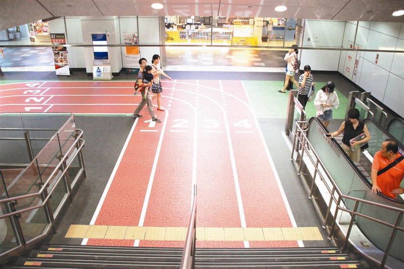 機場捷運為迎接世大運,A9林口站從二樓延伸到三樓變身田徑場,序號排列整齊的跑道,旅客變身選手蓄勢待發。圖/許政榆