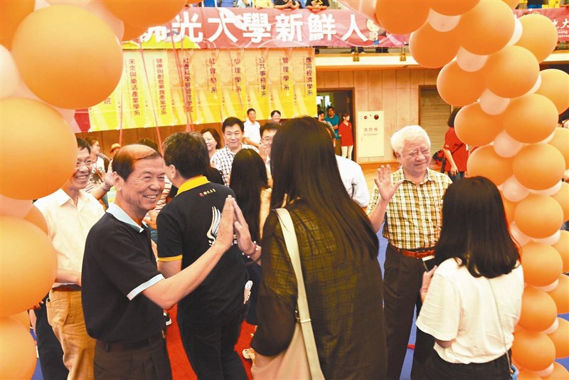 楊朝祥校長和校內的一級主管在新生通過「大學之門」時,一一和新生擊掌加油。圖/佛光大學提供