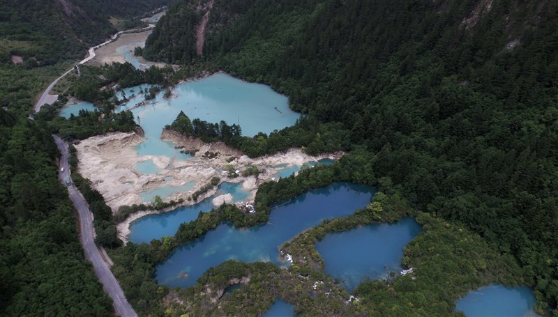 中國大陸四川省九寨溝8日發生芮氏規模7.0強震,九寨溝景區內景點受損;圖為已見湖底的火花海。圖/中央社