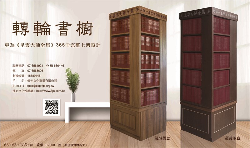 佛光文化商品 轉輪書櫥 |2017.08.15 語音朗讀 1141觀看次 字級 大 中 小 佛光文化商品 轉輪書櫥 專為《星雲大師全集》365冊完整上架設計 詳情請洽服務電話:07-6561921 分機6664~6 前一篇文章 大師全集365冊 下一篇文章 勝鬘書院 行腳雲遊世界 熱門新聞 01【讓愛自由】纏繞與獨立之間2026.04.0202新生首次到校2026.04.0203星雲大師靈骨分燈泰國 化益世人2026.04.0204打字機重返課堂 對抗AI代寫2026.04.0205緬甸佛學院訪佛光山 深化教育弘法發展2026.04.0206租賃車業者違法攬客 觀光署:最高罰200萬元2026.04.0707日月潭蓄水率 跌破6成2026.04.0208睡足多運動常吃蔬菜 改善生活習慣促健康2026.04.0209徐若熙日職初登板 6局6K奪首勝2026.04.0210奧斯陸佛光童軍 體驗禪修學滑雪2026.04.02 訂閱電子報 台北市 天氣預報 台灣一週天氣預報 相關報導 以文字護持人間福報運動睡眠新科技 養生保健新利器房仲第一品牌 永慶加薪3% 體驗美好手作 製皂幸福時光 博愛社大春季班招生中 薩克斯風吹奏春季班 人間大學台中分校招生中 跨越十年縱橫南半球到北半球 《行者》新書上市