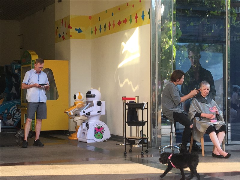 理容院替顧客剪頭髮到一半,只能把工具台推出戶外,利用自然光替顧客剪髮。