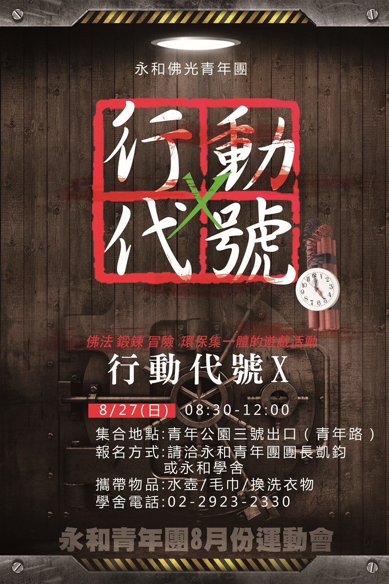 永和學舍青年團運動會 |2017.08.16 語音朗讀 648觀看次 字級 大 中 小 永和學舍青年團運動會 永和學舍青年團8月份運動會將結合佛法、運動、冒險遊戲於一身,在8月27日以行動代號X為名展開華麗的冒險。參加者將騎腳踏車一面撿垃圾做環保,同時在撿垃圾的路線中隱藏有關佛法的問答題可做為佛法交流。 前一篇文章 多彩貴州非物質文化遺產演出 下一篇文章 佛光緣美術館台中館展覽 熱門新聞 01【讓愛自由】纏繞與獨立之間2026.04.0202新生首次到校2026.04.0203明德水庫蓄水量僅27% 今起供4停42026.04.0104星雲大師靈骨分燈日本 法燈長明2026.04.0105中美並重 鄭麗文傳6月訪美2026.04.0106星雲大師靈骨分燈泰國 化益世人2026.04.02079公尺高恐龍 現身澄清湖2026.04.0108東京櫻花滿開2026.04.0109打字機重返課堂 對抗AI代寫2026.04.0210睽違53年 NASA載人繞月1日升空2026.04.01 訂閱電子報 台北市 天氣預報 台灣一週天氣預報 相關報導 以文字護持人間福報運動睡眠新科技 養生保健新利器房仲第一品牌 永慶加薪3% 體驗美好手作 製皂幸福時光 博愛社大春季班招生中 薩克斯風吹奏春季班 人間大學台中分校招生中 跨越十年縱橫南半球到北半球 《行者》新書上市