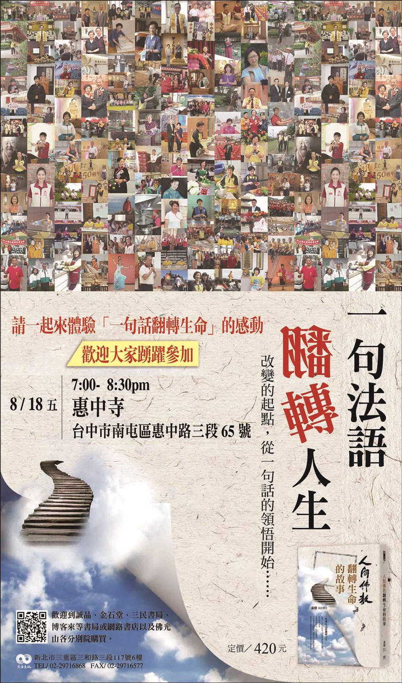 香海文化「人間佛教 翻轉生命的故事」新書發表會 |2017.08.17 語音朗讀 909觀看次 字級 大 中 小 香海文化「人間佛教 翻轉生命的故事」新書發表會 請一起來體驗「一句話翻轉生命」的感動 8/18(五)晚上7:00-8:00於惠中寺舉辦新書發表會 地址:台中市南屯區惠中路三段65號 前一篇文章 2017年佛光山在家五戒菩薩戒會通啟 下一篇文章 金蘭陳年香菇素蠔油 熱門新聞 01【讓愛自由】纏繞與獨立之間2026.04.0202新生首次到校2026.04.0203明德水庫蓄水量僅27% 今起供4停42026.04.0104星雲大師靈骨分燈日本 法燈長明2026.04.0105星雲大師靈骨分燈泰國 化益世人2026.04.0206東京櫻花滿開2026.04.01079公尺高恐龍 現身澄清湖2026.04.0108中美並重 鄭麗文傳6月訪美2026.04.0109打字機重返課堂 對抗AI代寫2026.04.0210睽違53年 NASA載人繞月1日升空2026.04.01 訂閱電子報 台北市 天氣預報 台灣一週天氣預報 相關報導 以文字護持人間福報運動睡眠新科技 養生保健新利器房仲第一品牌 永慶加薪3% 體驗美好手作 製皂幸福時光 博愛社大春季班招生中 薩克斯風吹奏春季班 人間大學台中分校招生中 跨越十年縱橫南半球到北半球 《行者》新書上市