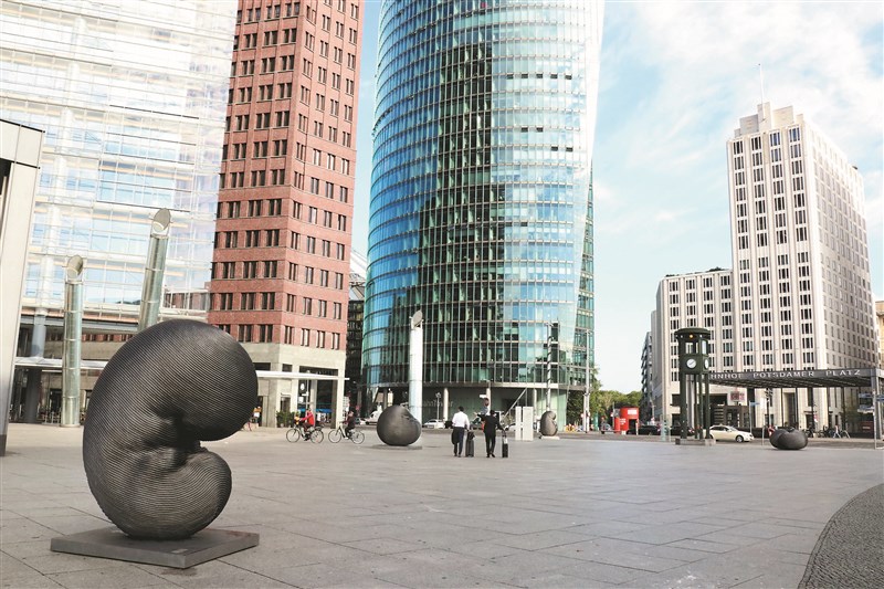 德國波茲坦廣場矗立著宛若生命胚胎的雕塑,它們的前身是台北101大樓淘汰的電梯鋼纜。圖/康木祥提供