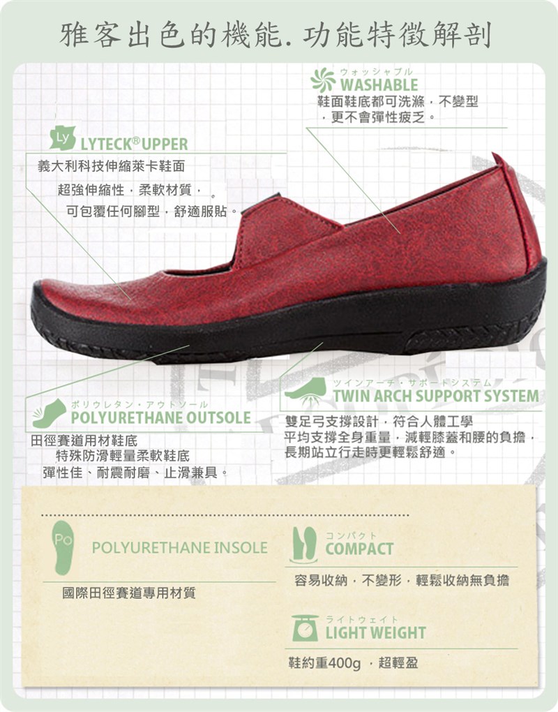 ARCOPEDICO的鞋子特色,包括鞋面富彈性伸縮特性,可完整包覆各種腳型,尤其是有拇趾外翻或是特殊腳型,不擠壓不壓迫,有如第二雙襪子般的舒適感,雙足弓抗震彈性鞋底,符合人體工學支撐概念,平均分散全身重力,輕鬆舒適,久站久走,雙腳無負擔。簡單時尚的造型,有著輕鬆舒適的特質,讓您可以穿得好看,走的輕鬆,活出健康。