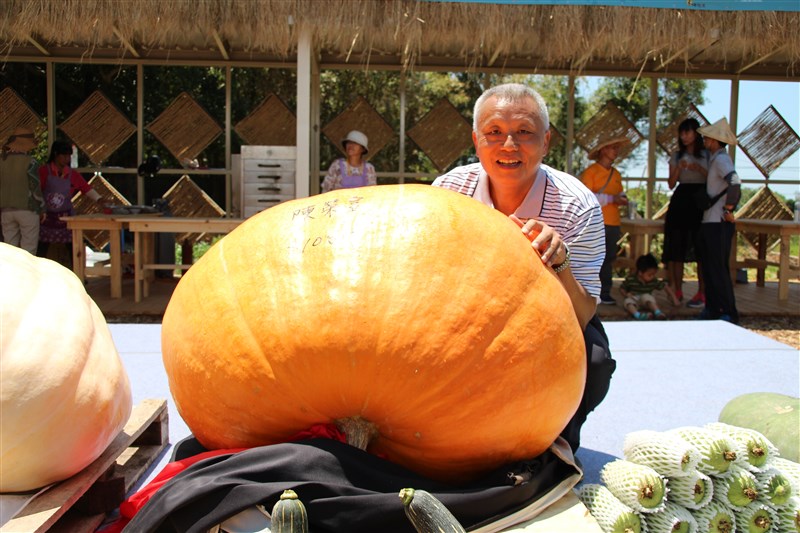 陳榮富說,觀音地區許多老人家,退休後閒著沒事,社區發展會鼓勵大家種蔬果。今年因防水設施沒做好,大南瓜因根部浸水而長不大,若沒有意外,原本可長到500、600公斤以上。