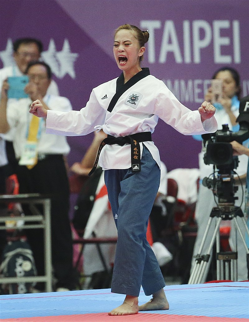 林侃諭在跆拳道女子個人品勢項目拿到銀牌,為中華隊進帳本屆世大運首面獎牌。圖/黃威彬