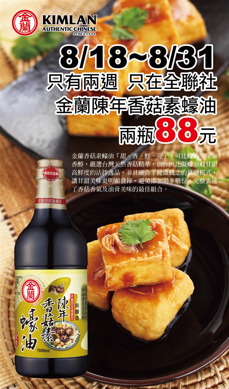 為回饋消費者的愛護,慶讚中元來臨,8月18日到8月31 日,只在全聯社, 金蘭陳年香菇素蠔油, 兩瓶特價88元(每瓶1000ml)。