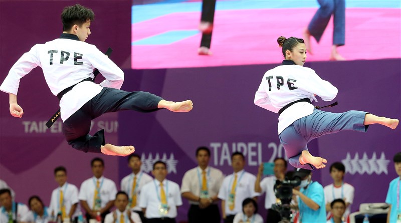 【本報台北訊】世大運跆拳道品勢今天進入最後一項混雙項目,李晟綱與蘇佳恩以完美的4個空翻動作,技壓全場,公認品勢拿下8.06分,自由品勢更是高達7.53分,加權後成績7.853分,替中華隊再摘下1金,2天以來品勢5個項目共收下1金3銀1銅的好成績。