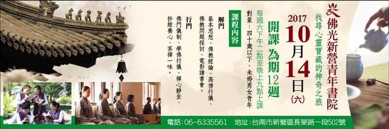 佛光新營青年書院 |2017.08.24 語音朗讀 506觀看次 字級 大 中 小 金蘭香菇素蠔油 香醇高鮮 招生對象:四十歲以下,未婚男女青年。 開課時間:2017年10月14日(六),下午二點至晚上九點,為期12週 洽詢電話:06-633-5561 地址:台南市新營區長榮路一段502號 前一篇文章 金蘭香菇素蠔油 香醇高鮮 下一篇文章 佛光山人間大學台中分校106秋季班招生 熱門新聞 01佛光山月光寺啟用 花蓮心靈新地標2026.03.2902推動科學辦案 鑑識權威李昌鈺87歲辭世2026.03.2903道奇頒冠軍戒 大谷喊要更多枚2026.03.2904中職開幕戰 猿隊險勝兄弟2026.03.2905川普誇耀政績 陸採購大豆倍增2026.03.2906最大規模無王日 逾3200場反川示威2026.03.3007汽油飆漲 1.7 元 創 11 年半新高2026.03.2908宜蘭綠博會 探索真理2026.03.3009陸首都維安 北京全面管制無人機2026.03.3010MLB 鄧愷威轉隊太空人 初登板奪首勝2026.03.30 訂閱電子報 台北市 天氣預報 台灣一週天氣預報 相關報導 以文字護持人間福報運動睡眠新科技 養生保健新利器房仲第一品牌 永慶加薪3% 體驗美好手作 製皂幸福時光 博愛社大春季班招生中 薩克斯風吹奏春季班 人間大學台中分校招生中 跨越十年縱橫南半球到北半球 《行者》新書上市