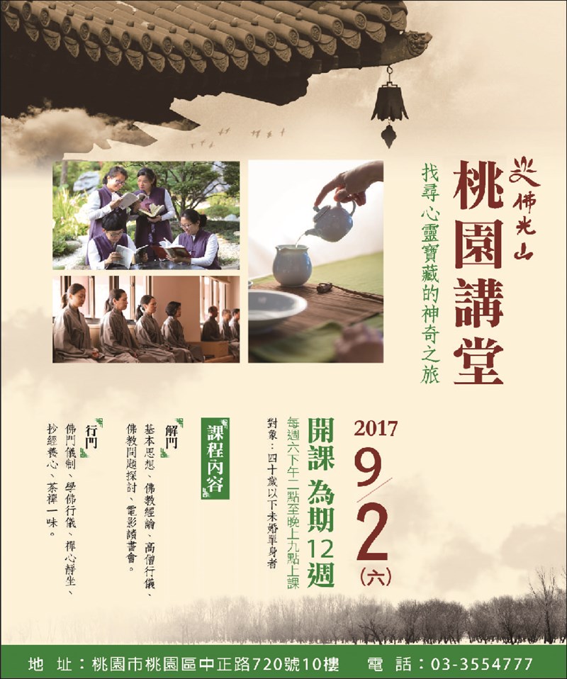 桃園講堂佛學課程 |2017.08.28 語音朗讀 459觀看次 字級 大 中 小 桃園講堂佛學課程 學員資格:四十歲以下未婚單身者 開課時間:9/2(六)每週六下午二點至晚上九點上課 詳請請洽詢:03-355-4777 前一篇文章 福慧家園共修會福慧雙修 下一篇文章 妙檀香超濃縮洗衣粉、洗衣精 熱門新聞 01佛光山365日越文版 贈西貢日航大酒店2026.03.2702紅綠葡萄抗氧化抗發炎 連皮吃獲取健康全效益2026.03.2703台灣工藝3專書 呈現文化獨特樣貌2026.03.2704中職37年 明大巨蛋開幕戰2026.03.2705博鰲論壇 黃循財:支持陸加入CPTPP2026.03.2706南華創校30年 百年樹人邁向永續2026.03.2707照明工具 原理與演進2026.03.2708西半部冬季降雨75年新低 新竹水情亮黃燈2026.03.2709把握遠視儲備期 防兒童近視惡化2026.03.2710人間佛教聯合總會訪三燭寺 互勉弘法利生2026.03.27 訂閱電子報 台北市 天氣預報 台灣一週天氣預報 相關報導 以文字護持人間福報運動睡眠新科技 養生保健新利器房仲第一品牌 永慶加薪3% 體驗美好手作 製皂幸福時光 博愛社大春季班招生中 薩克斯風吹奏春季班 人間大學台中分校招生中 跨越十年縱橫南半球到北半球 《行者》新書上市