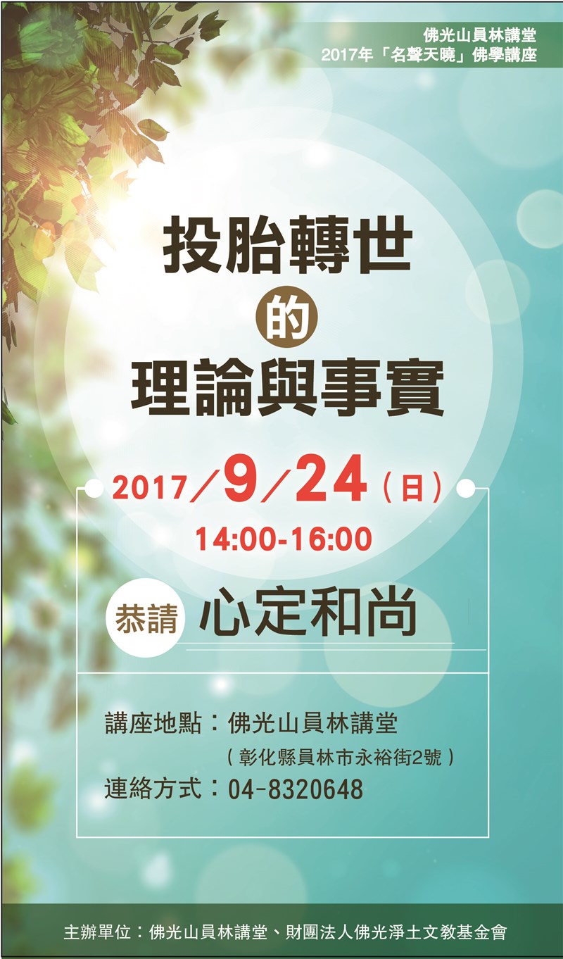 佛光山員林講堂2017年「名聲天曉」佛學講座 |2017.08.29 語音朗讀 1199觀看次 字級 大 中 小 佛光山員林講堂2017年「名聲天曉」佛學講座 時間:2017年9月24日星期日,下午2點至4點 講座地點:佛光山員林講堂(彰化縣員林鎮永裕街2號) 聯絡方式:04-8320648 前一篇文章 2017年佛光山菩薩義工研習營 下一篇文章 禪淨法堂禪修會心保和尚主七 熱門新聞 01佛光山365日越文版 贈西貢日航大酒店2026.03.2702紅綠葡萄抗氧化抗發炎 連皮吃獲取健康全效益2026.03.2703台灣工藝3專書 呈現文化獨特樣貌2026.03.2704中職37年 明大巨蛋開幕戰2026.03.2705博鰲論壇 黃循財:支持陸加入CPTPP2026.03.2706南華創校30年 百年樹人邁向永續2026.03.2707西半部冬季降雨75年新低 新竹水情亮黃燈2026.03.2708照明工具 原理與演進2026.03.2709把握遠視儲備期 防兒童近視惡化2026.03.2710人間佛教聯合總會訪三燭寺 互勉弘法利生2026.03.27 訂閱電子報 台北市 天氣預報 台灣一週天氣預報 相關報導 以文字護持人間福報運動睡眠新科技 養生保健新利器房仲第一品牌 永慶加薪3% 體驗美好手作 製皂幸福時光 博愛社大春季班招生中 薩克斯風吹奏春季班 人間大學台中分校招生中 跨越十年縱橫南半球到北半球 《行者》新書上市
