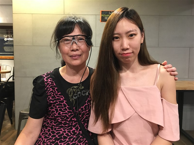 夜盲症病友蘇小姐(左)戴上電子眼的特製眼鏡,可看到女兒(右)的模糊輪廓。 圖/鄧桂芬