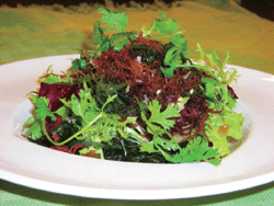 4.將生菜盛入碗內,撒上海藻淋上醬汁,放些香菜葉即可上桌了。