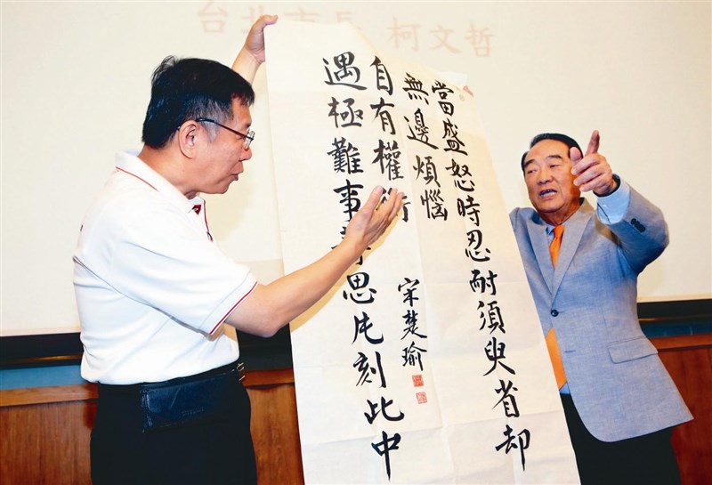柯文哲課程開始前,宋楚瑜還將親筆書寫,由書法家于右任所做:「當盛怒時,忍耐須臾省卻無邊煩惱;遇極難事,靜思片刻此中自有權衡」對聯親送柯,請柯生氣時要忍耐須臾,做大決定前靜思片刻,這是給柯加油,也是親民黨自我期許。