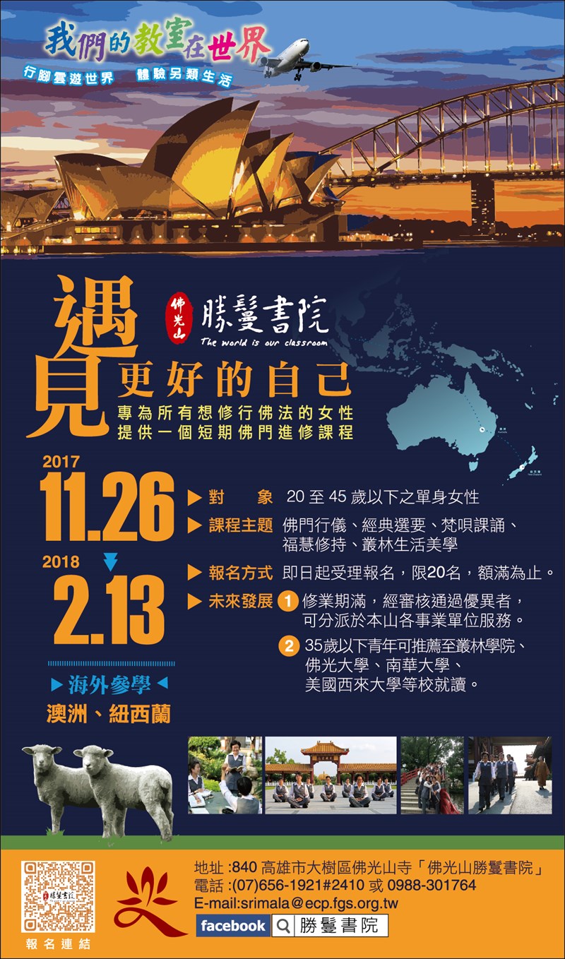 勝鬘書院 行腳雲遊世界 |2017.09.02 語音朗讀 606觀看次 字級 大 中 小 勝鬘書院 行腳雲遊世界 對象:20至45歲以下之單身女性,即日起受理報名。 前一篇文章 衛福部拒菸5式癮君子切記 下一篇文章 冰烤地瓜王的領航者 熱門新聞 01南華大學茶禪雅集 靜坐書寫時光膠囊2026.03.2602星雲大師靈骨分燈歐洲 傳燈萬方2026.03.2603佛光山365日越文版 贈西貢日航大酒店2026.03.2704紅綠葡萄抗氧化抗發炎 連皮吃獲取健康全效益2026.03.2705台灣工藝3專書 呈現文化獨特樣貌2026.03.2706中職37年 明大巨蛋開幕戰2026.03.2707兒童節禮物 新北學生自己票選2026.03.2608北京中學老師 精準預言美伊開戰2026.03.2609全球首例 菲國進入能源緊急狀態2026.03.2610滑雪勝地轉型 數位遊牧族進駐2026.03.26 訂閱電子報 台北市 天氣預報 台灣一週天氣預報 相關報導 以文字護持人間福報運動睡眠新科技 養生保健新利器房仲第一品牌 永慶加薪3% 體驗美好手作 製皂幸福時光 博愛社大春季班招生中 薩克斯風吹奏春季班 人間大學台中分校招生中 跨越十年縱橫南半球到北半球 《行者》新書上市