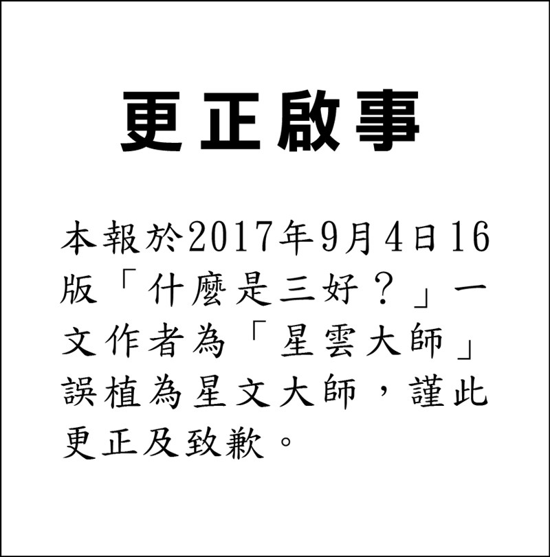 更正啟事 |2017.09.05 語音朗讀 3559觀看次 字級 大 中 小 更正啟事 本報於2017年9月4日16版「什麼是三好?」一文作者「星雲大師」誤植為星文大師,僅此更正及致歉。 前一篇文章 妙檀香超濃縮洗衣粉、洗衣精 下一篇文章 《三好一生》星雲大師 著 熱門新聞 01故宮特展神獸再現 麒麟、鳳凰登場 2026.03.2402南華大學茶禪雅集 靜坐書寫時光膠囊2026.03.2603星雲大師靈骨分燈歐洲 傳燈萬方2026.03.2604【詩】白花鬼2026.03.2505佛光山365日越文版 贈西貢日航大酒店2026.03.2706紅綠葡萄抗氧化抗發炎 連皮吃獲取健康全效益2026.03.2707台灣工藝3專書 呈現文化獨特樣貌2026.03.2708星雲大師靈骨分燈北美 法脈永傳2026.03.2409中南部水庫水位告急 各地農損頻傳2026.03.2410兒童節禮物 新北學生自己票選2026.03.26 訂閱電子報 台北市 天氣預報 台灣一週天氣預報 相關報導 以文字護持人間福報運動睡眠新科技 養生保健新利器房仲第一品牌 永慶加薪3% 體驗美好手作 製皂幸福時光 博愛社大春季班招生中 薩克斯風吹奏春季班 人間大學台中分校招生中 跨越十年縱橫南半球到北半球 《行者》新書上市
