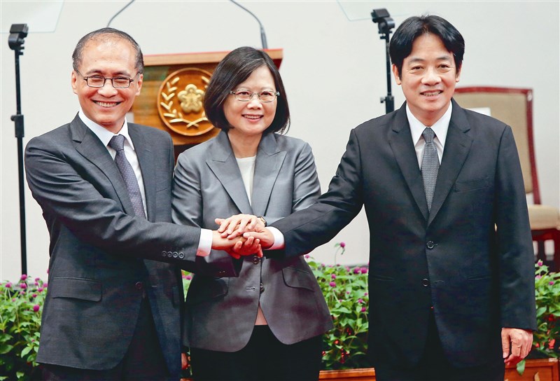 蔡總統(中)昨宣布新任行政院長由賴清德(右)接任,但「這不表示同意即將卸任的行政院長林全(左)離開團隊」。圖/中央社