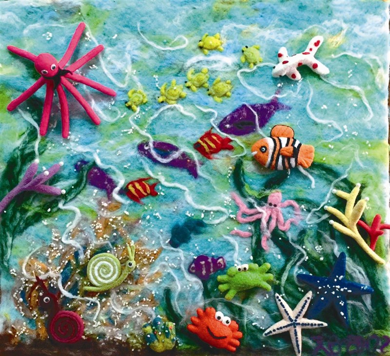 趙桂妃以戮針創作出長寬達兩尺的〈海底總動員〉羊毛氈畫。圖/中央社